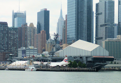 Only 38 miles to run this morning and the Captain's Lounge at Liberty landing has Verizon Fibe TV. We watched the German Grand Prix before setting out on a grey day. We couldn't time our trip without fighting the tide most of the day. We passed by Concorde and carrier Intrepid.